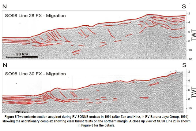 RV SONNE vessel cruises 98 acquired regional seismic sections across Sulawesi Sea Basin. One of the north-south sections displayed in Figure 4, shows general deepening of Sulawesi Sea basin to the south. The Miocene horizons clearly go beneath the thrusted zone or the accretionary complex in the north of Sulawesi.